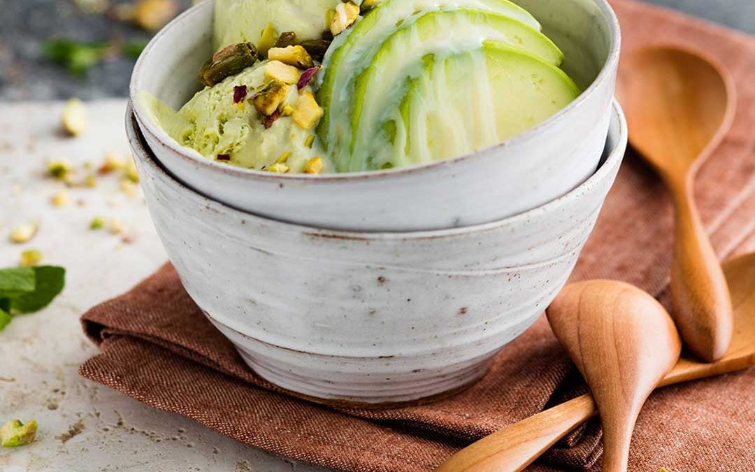 6. आइस क्रीम को एक कटोरी में भरें और ऊपर कटे हुए एवोकाडो, संघनित (गाढ़ा) दूध, और कटे हुए पिस्ते सजायें।